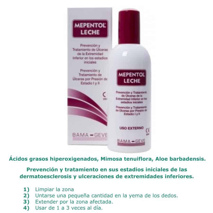 Mepentol Leche – Prevención y tratamiento en sus estadios iniciales de las dermatoesclerosis y ulceraciones de extremidades inferiores.