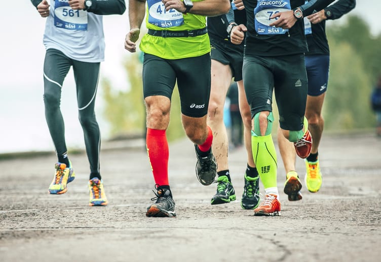 Corredores utilizando calcetas de compresión durante una carrera